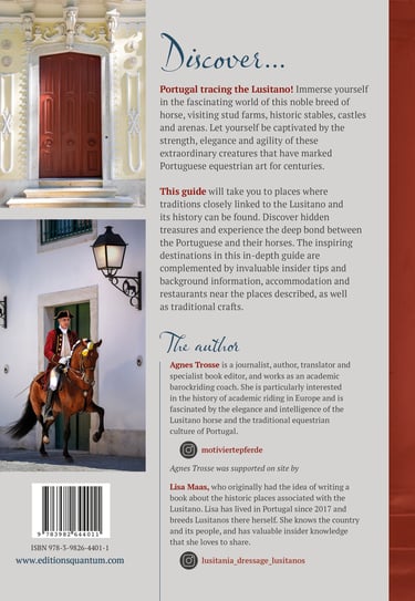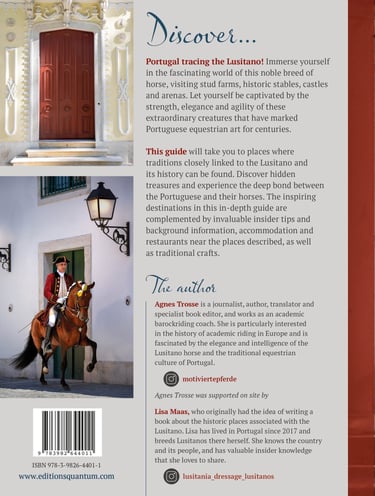 You love travelling, you are you passionate about horsemanship, working with horses, iberian and baroque horses and perhaps especially about the Lusitano? Would you like to learn more about this magnificent breed, its country of origin and the cultural background that has made the Lusitano what it is today? Do you also love shopping and are you excited about traditional Portuguese equestrian items? Great! This book is perfect for you and will give you the background knowledge you need for your next visit to Portugal! The book is available in the shop of my mini-publishing house Editions Quantum. It is available in English, French and German.