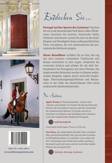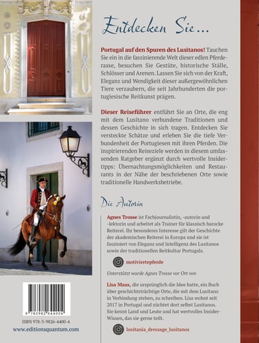 Du reist gerne, begeisterst Dich für Reitkunst, Working Equitation, Barockpferde und vielleicht ganz besonders für den Lusitano? Du möchtest mehr über diese tolle Pferderasse, ihr Ursprungsland und die kulturellen Hintergründe erfahren, die den Lusitano zu dem gemacht haben, was er heute ist? Außerdem gehst Du gerne einkaufen und begeisterst Dich für traditionelle Artikel rund um die portugiesische Reitkunst? Prima! Dann ist dieses Buch genau das Richtige für Dich und liefert Dir das nötige Hintergrundwissen für Deinen nächsten Besuch in Portugal! Du findest das Buch im Shop des Mini-Verlags Editions Quantum. Es ist auf Deutsch, Englisch und Französisch erhältlich.